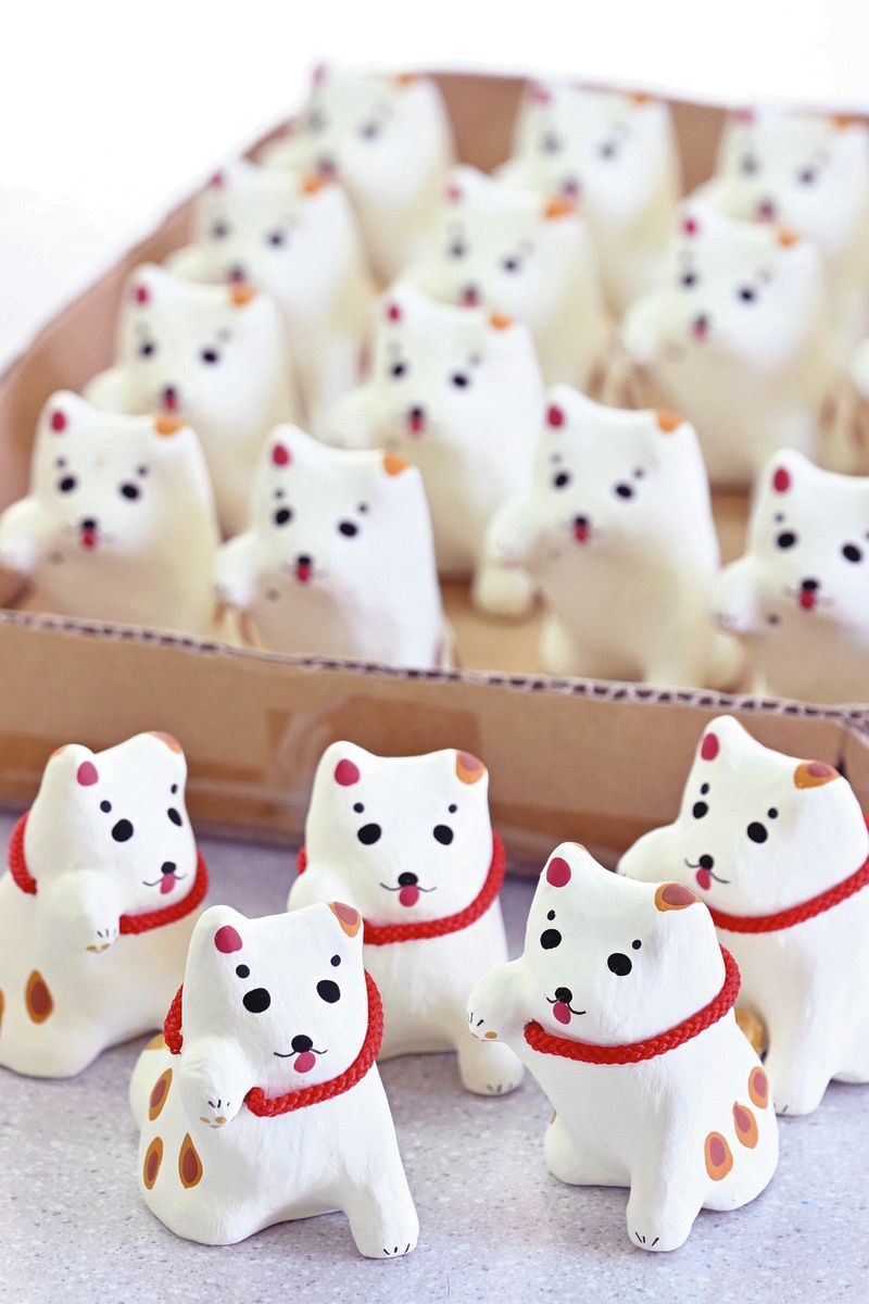 幡ヶ谷のぞみ作業所で作られている「のぞみ叶う招きハチ公」。後ろは赤い首輪をつけるなどの工程を待っているハチ公たち=東京都渋谷区で(池田まみ撮影)