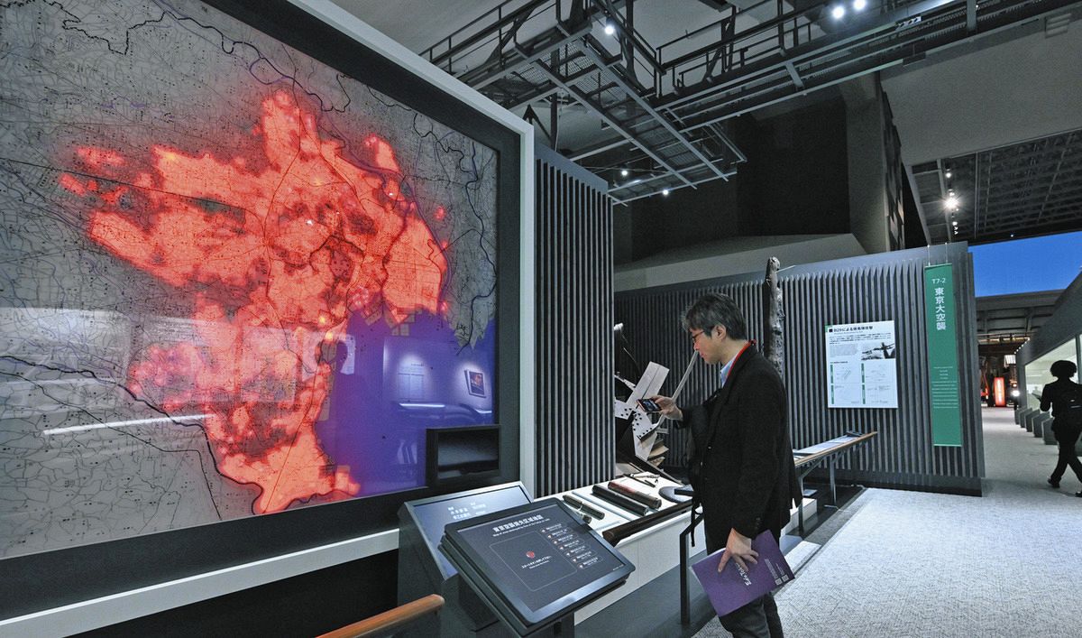 「東京空襲焼失区域地図」などが並ぶ東京大空襲のコーナー=25日、東京都墨田区の江戸東京博物館で(久野千恵子撮影)