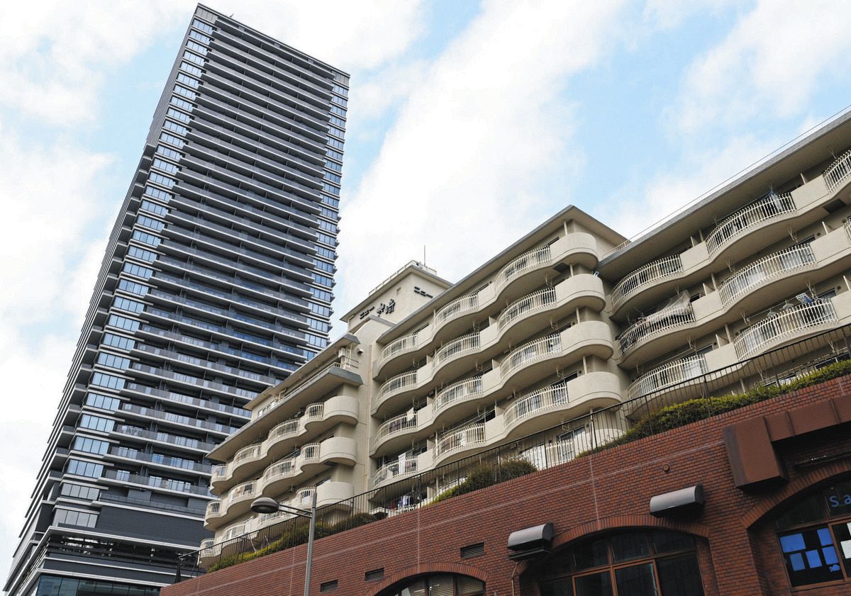 大崎駅西口の駅前に立つマンション「ニュー大崎」(手前)。住民らは再開発後、背後のマンションへの移転を勧められている(中村千春撮影)