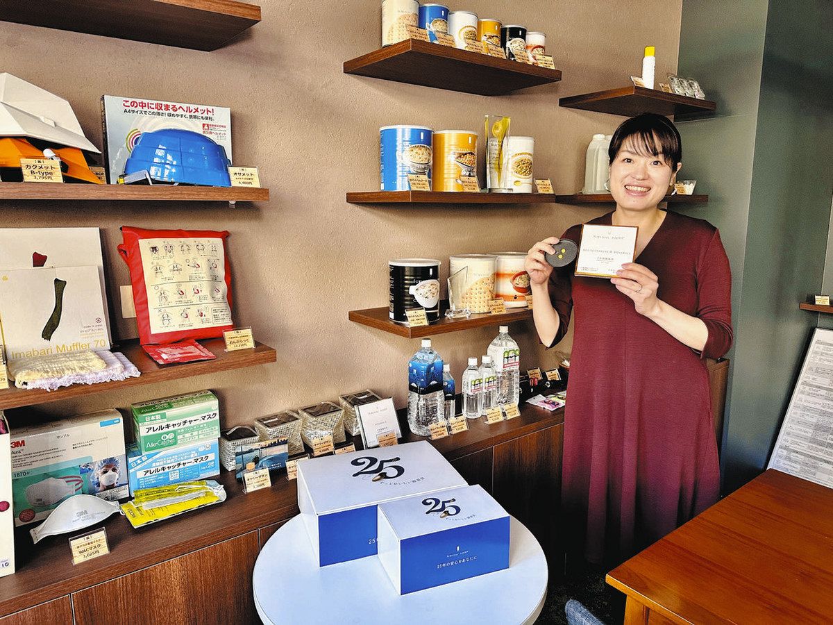 店長の布山夕紀さん。持つのは「サバイバルフーズサプリメント」。災害時に偏りがちな栄養分を補給できる(7年保存可)=いずれも東京都千代田区四番町で