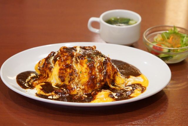 丸い皿に盛りつけられたオムライスはケチャップライスの上に半熟食感のオム玉子が載って、そのうえから茶色いデミグラスソースがかかっている(ケチャップのタイプもある)。