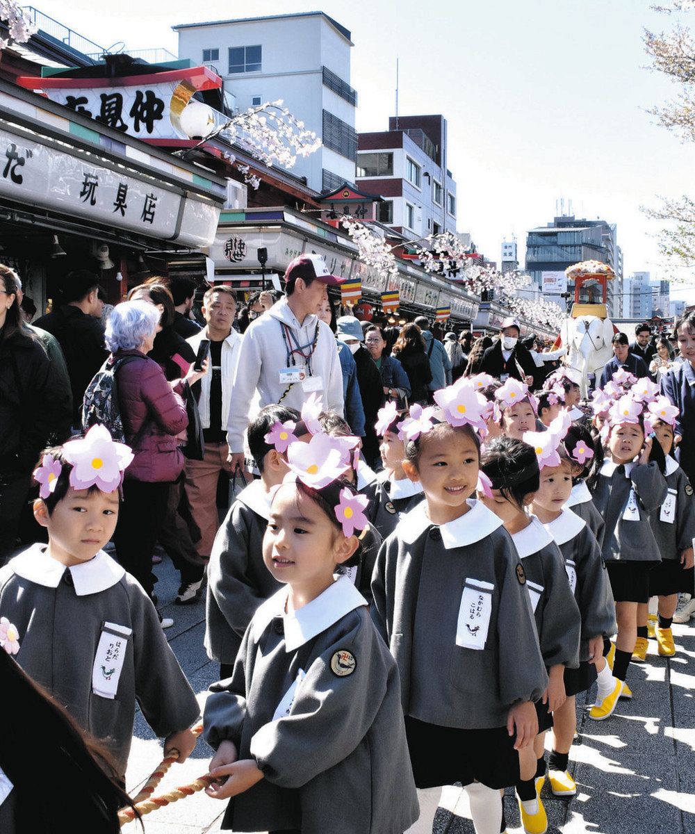 園児たちは、お釈迦様が生まれたとされるルンビニ(ネパール南部)の花園にちなんだ紙製の桜の冠を装着。仏教で縁起が良いとされる白い象の模型を引きながら、観光客でにぎわう仲見世商店街を通り、本堂まで元気よく歩いた。沿...