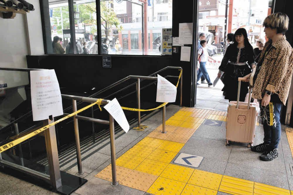 多くの外国人観光客でにぎわう東京都台東区の浅草駅周辺では、困惑する外国人利用者の姿も見られた。改札への階段の入り口には黄色い規制線が張られ、日本語と英語で運転状況が掲示された。