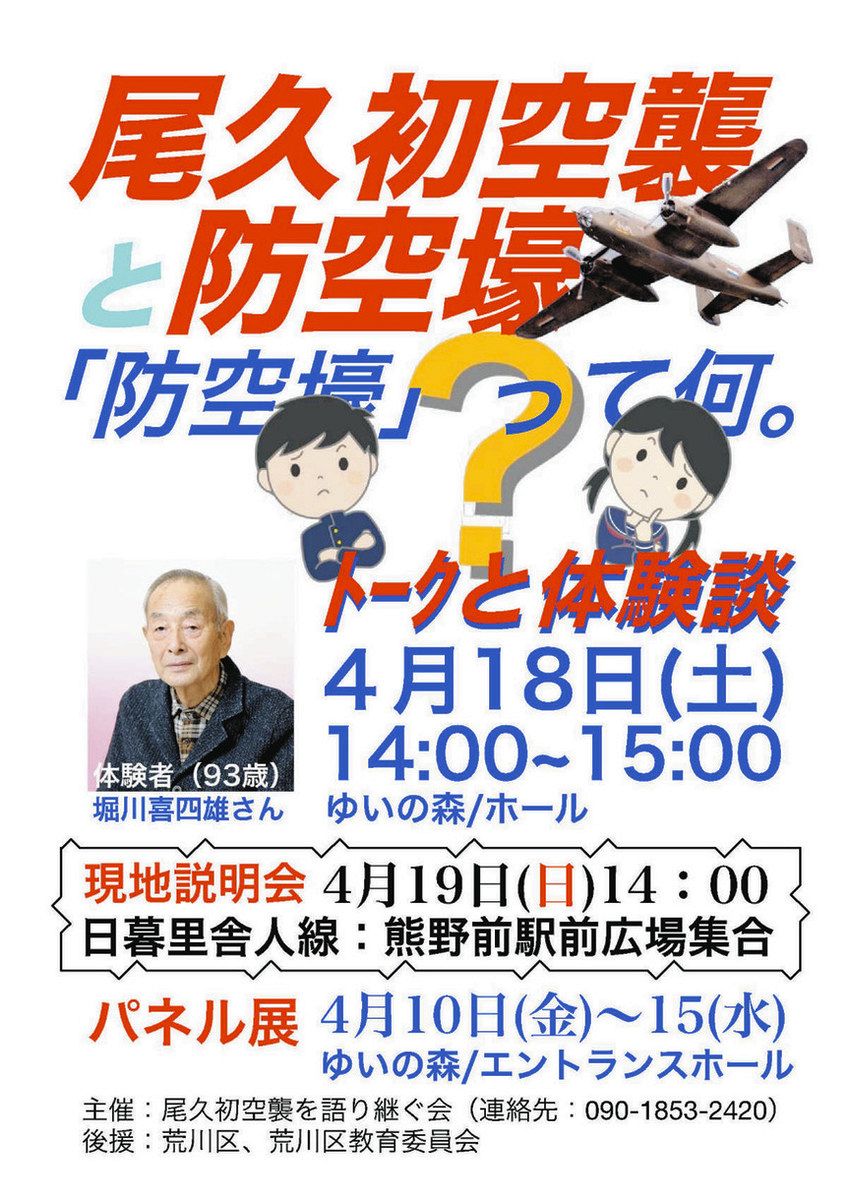 太平洋戦争で日本本土への初空襲となった「尾久初空襲」を語り継ぐ講演会「尾久初空襲と防空壕(ごう)~防空壕って何?~」が18日、ゆいの森...
