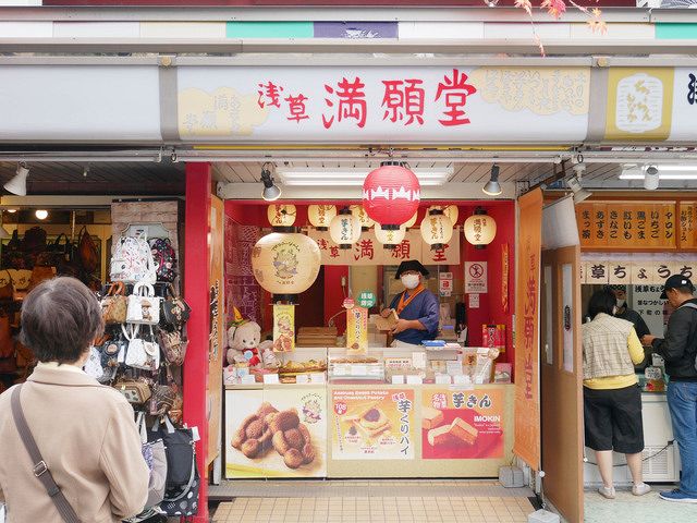 次に足を止めたのは「浅草満願堂仲見世店」です。ここでは、看板商品である芋きんを購入。仲見世店限定の提灯柄の焼印が特別感を醸し出しています。焼きたての芋きんはまだ温かく、なんだか幸せな気持ちになりました。