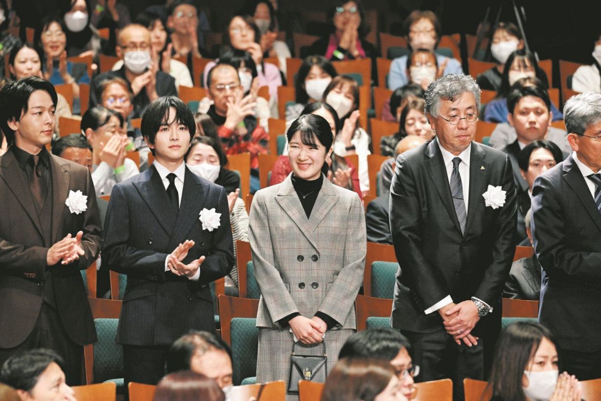 映画「ペリリュー楽園のゲルニカ」チャリティー上映会に出席された天皇、皇后両陛下の長女愛子さま。前列左は声優を務めた俳優の中村倫也さんと板垣李光人さん(同2人目)=27日、東京都千代田区で(代表撮影)